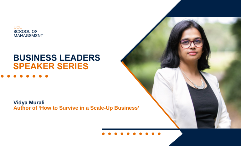 Vidya Murali, author of ‘How to Survive in a Scale-Up Business’ (Routledge, Aug 2025), will join UCL School of Management on Thursday 12 February, for the Business Leaders Speaker Series. Open to the entire UCL and Wharf Connect communities, Vidya will be sharing parts of her book that will inspire and help students, graduates and early career professionals step into roles at startups and scale-ups.