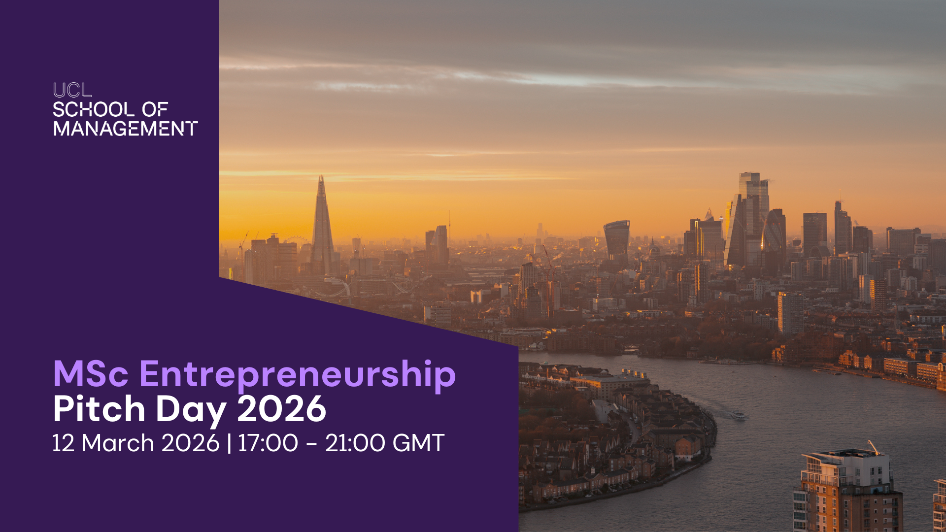 We invite you to join UCL School of Management on Thursday 12 March for the MSc Entrepreneurship Pitch Day 2026. Hosted on Level 50 of One Canada Square, this flagship event represents the final stage of a highly selective MSc Entrepreneurship pitch competition. The evening showcases a curated cohort of innovative, student-founded startups, developed and refined throughout the programme. Attendees will have the opportunity to explore these ventures, engage directly with founders, and gain insight into the entrepreneurial thinking shaping the next generation of high-growth businesses.