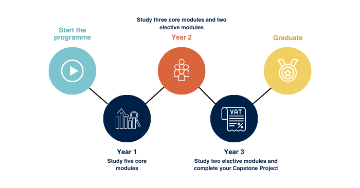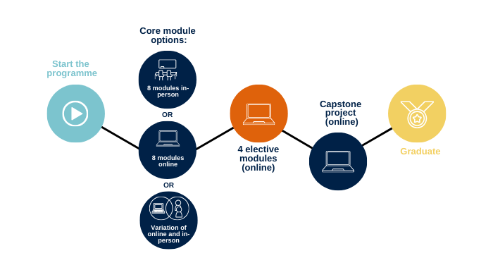 The figure below shows how your journey on the programme may take shape through core modules (in-person, online, or a variation of in-person and online), followed by the elective modules online, and capstone project online.