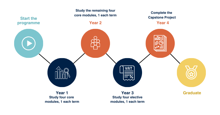 In this plan, you will study four core modules in year one and year two, study all of your elective modules in year three and finish with your capstone project in year four.