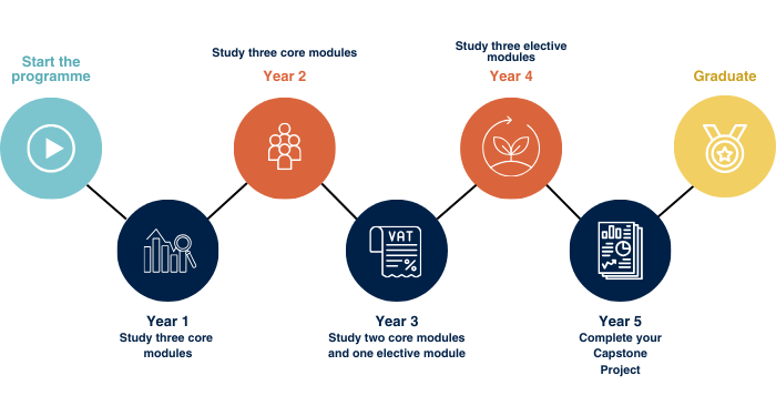 This plan gives you more time between classes, allowing you to study for two or three terms per-year. In this plan, you could study three core modules in year one and two, two elective modules in year three and four, and finish with your capstone project in year five.